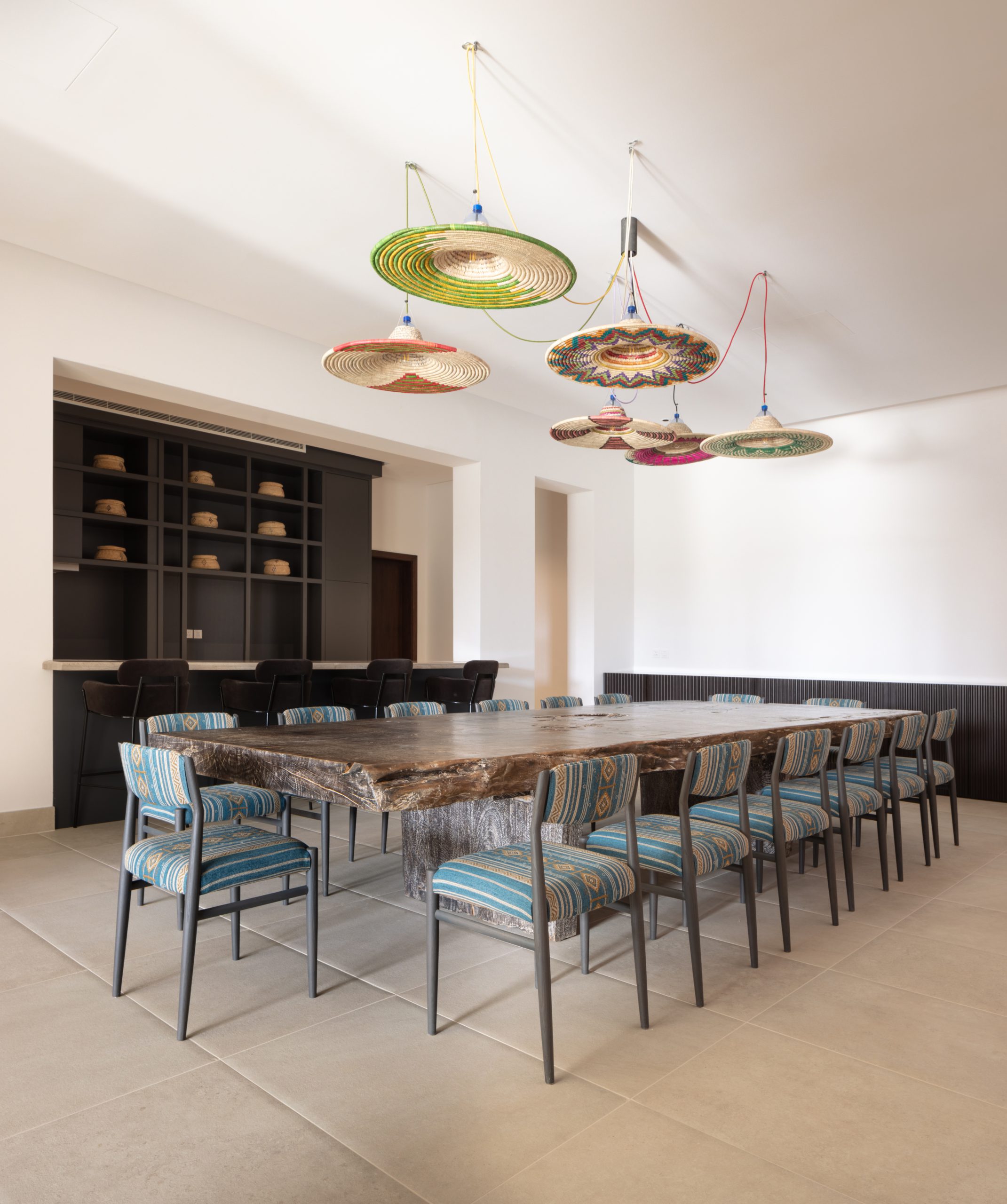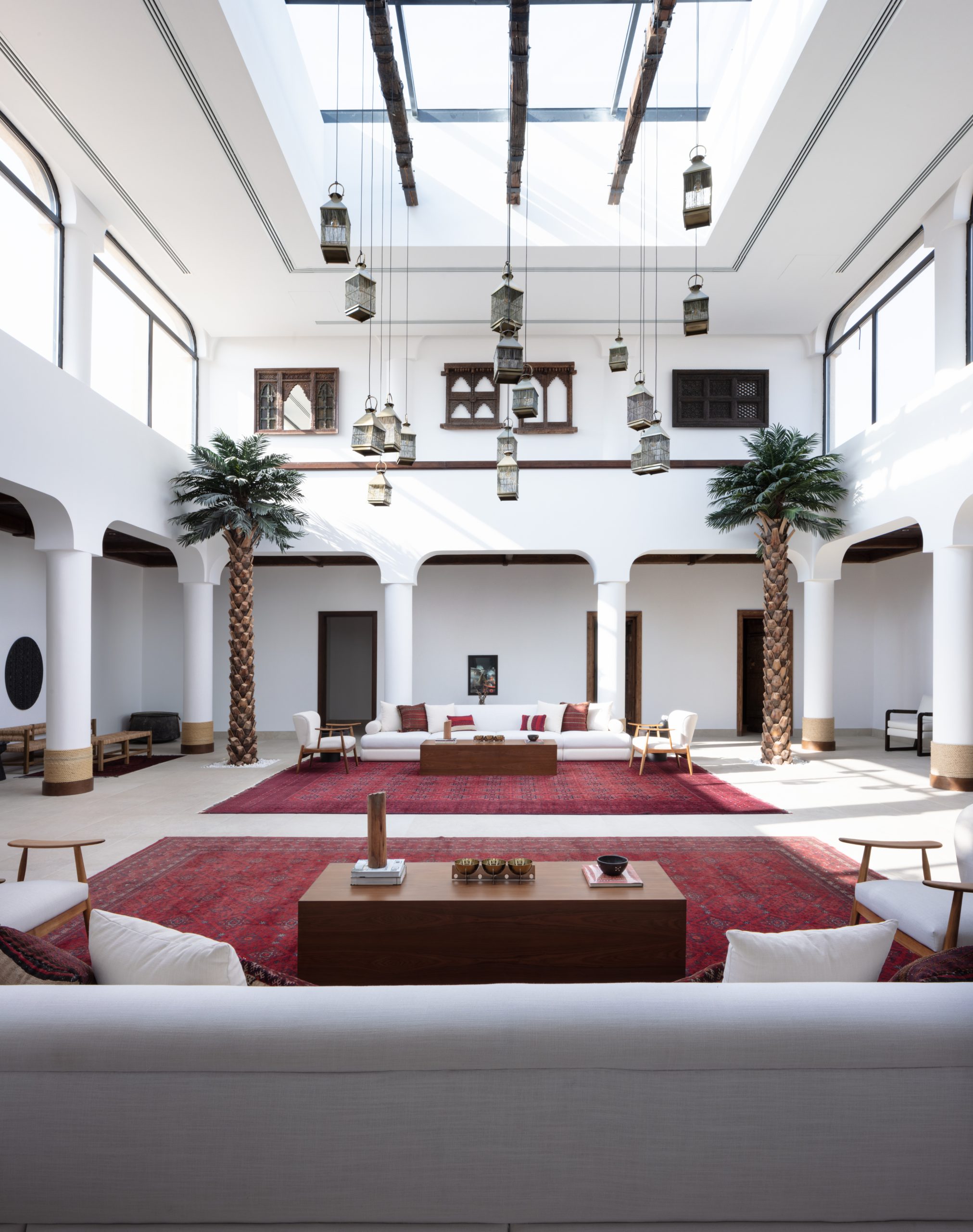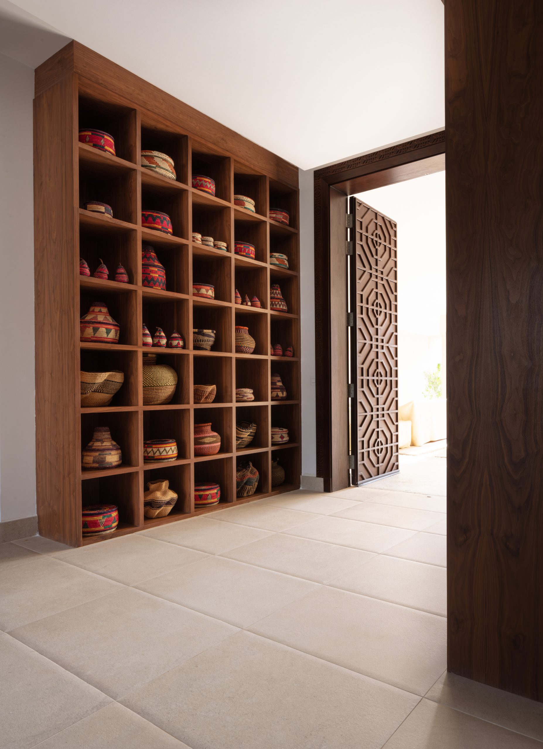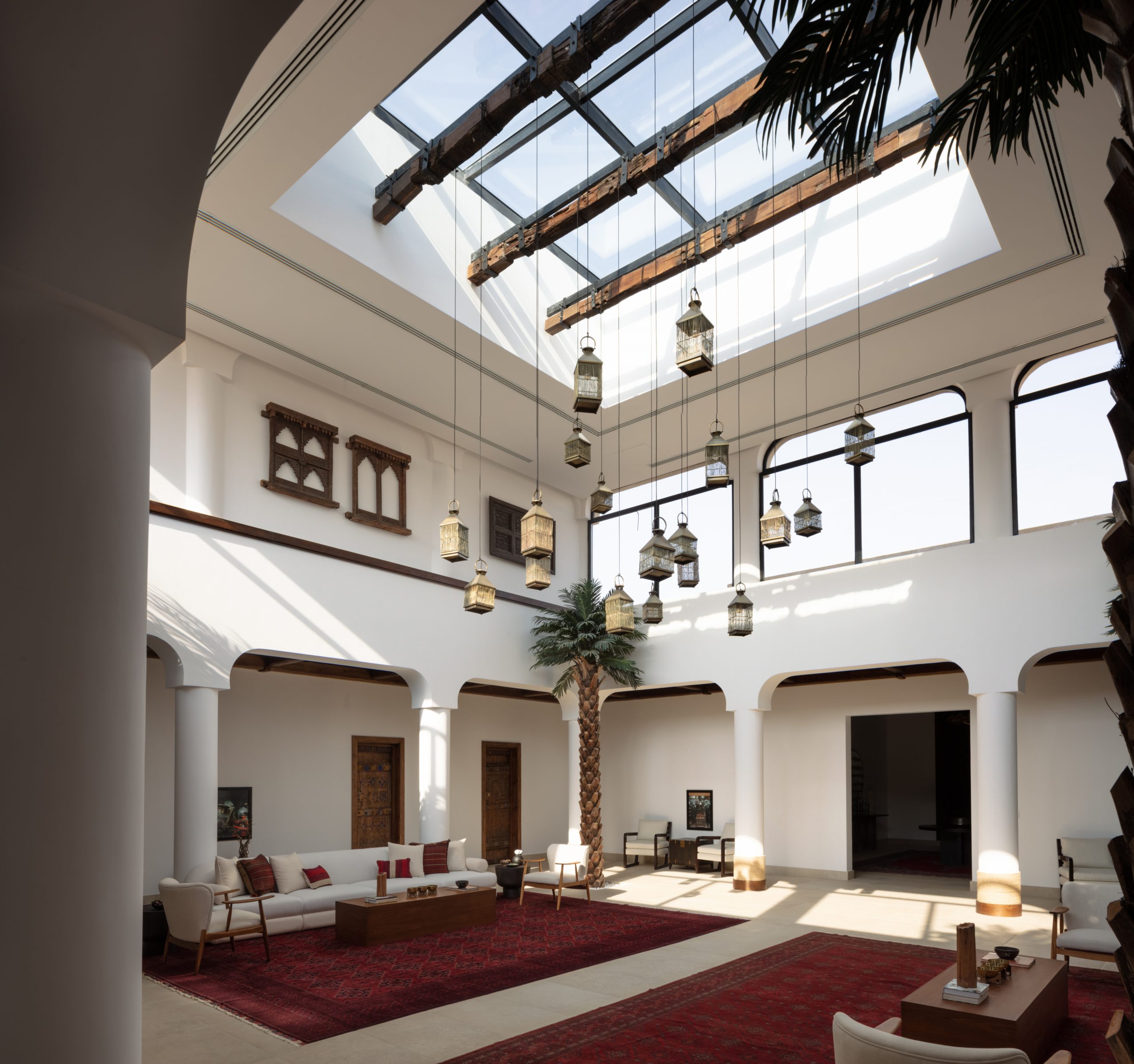 The farmhouse features elaborately carved wooden screens known as “mashrabiyas” which dominate the area, extending through the space from windows to hangings. These screens filter the sunlight and transform it into captivating rays and dancing patterns of shadows on the walls, imparting an imposing yet intricately detailed appearance. Additionally, Sadu textiles are used to adorn cushions and dining chairs, paying tribute to the farmhouse’s Saudi heritage.