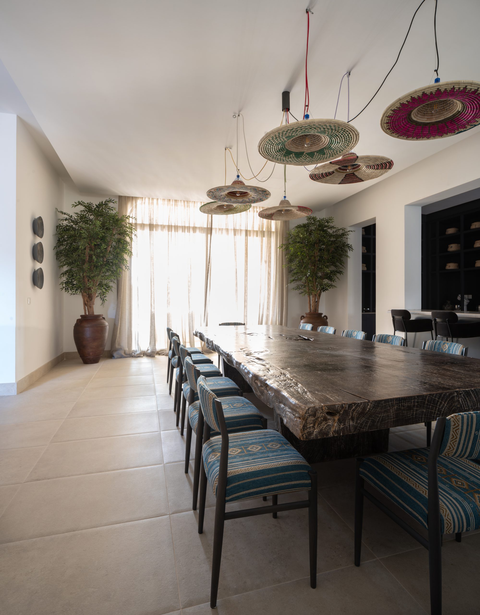 The living and dining areas are softly illuminated by hanging lanterns and basket lighting, which reinforces the sense of traditionalism while still keeping a contemporary feel. The design cleverly combines crisp, clean white lines with dark, rounded circles to create a complementary contrast. This balance is also reflected in the guest bathrooms, where an exposed natural stone wall coexists harmoniously with a modern double sink.