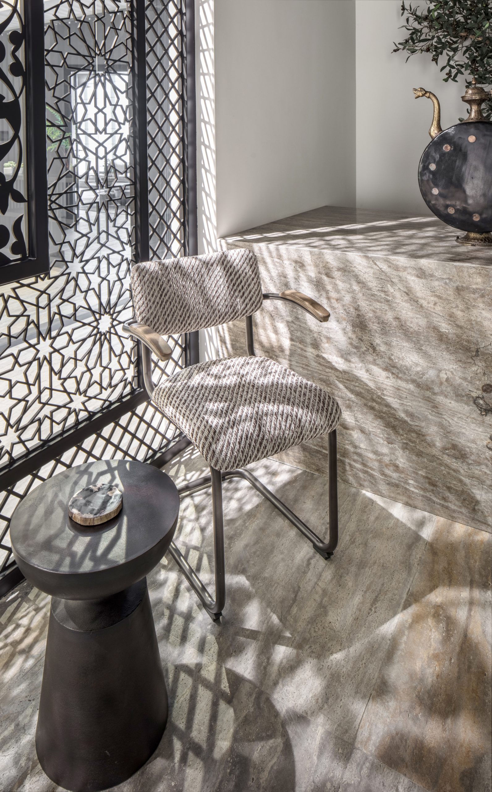 A carved Arabesque-motif screen stands tall, yet not imposing nor ridged, at the firm’s entrance, casting mesmerising shadows that offer privacy without preventing light passing through. This calming ambience, coupled with nods to nature, in the form of trees and plants, adorning the office, effortlessly offset the darker tones that anchor the rooms.