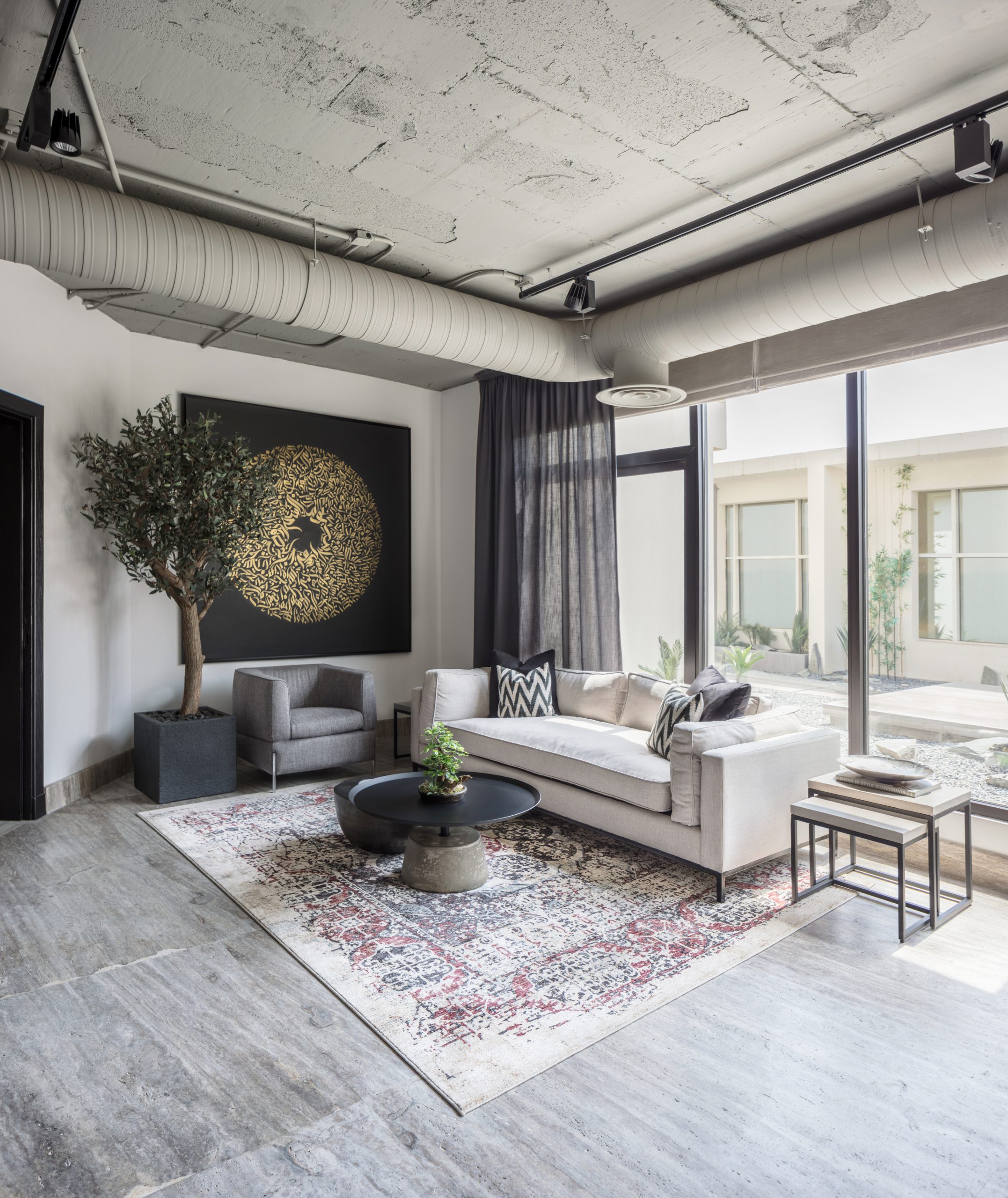 Painting the raw cement ceilings, AC vents and pipes in a soft grey colour, mirrors the silver travertine flooring, and creates a lightness which brought much needed breath and air to the rooms, in addition to creating a soft blank canvas for the office design.