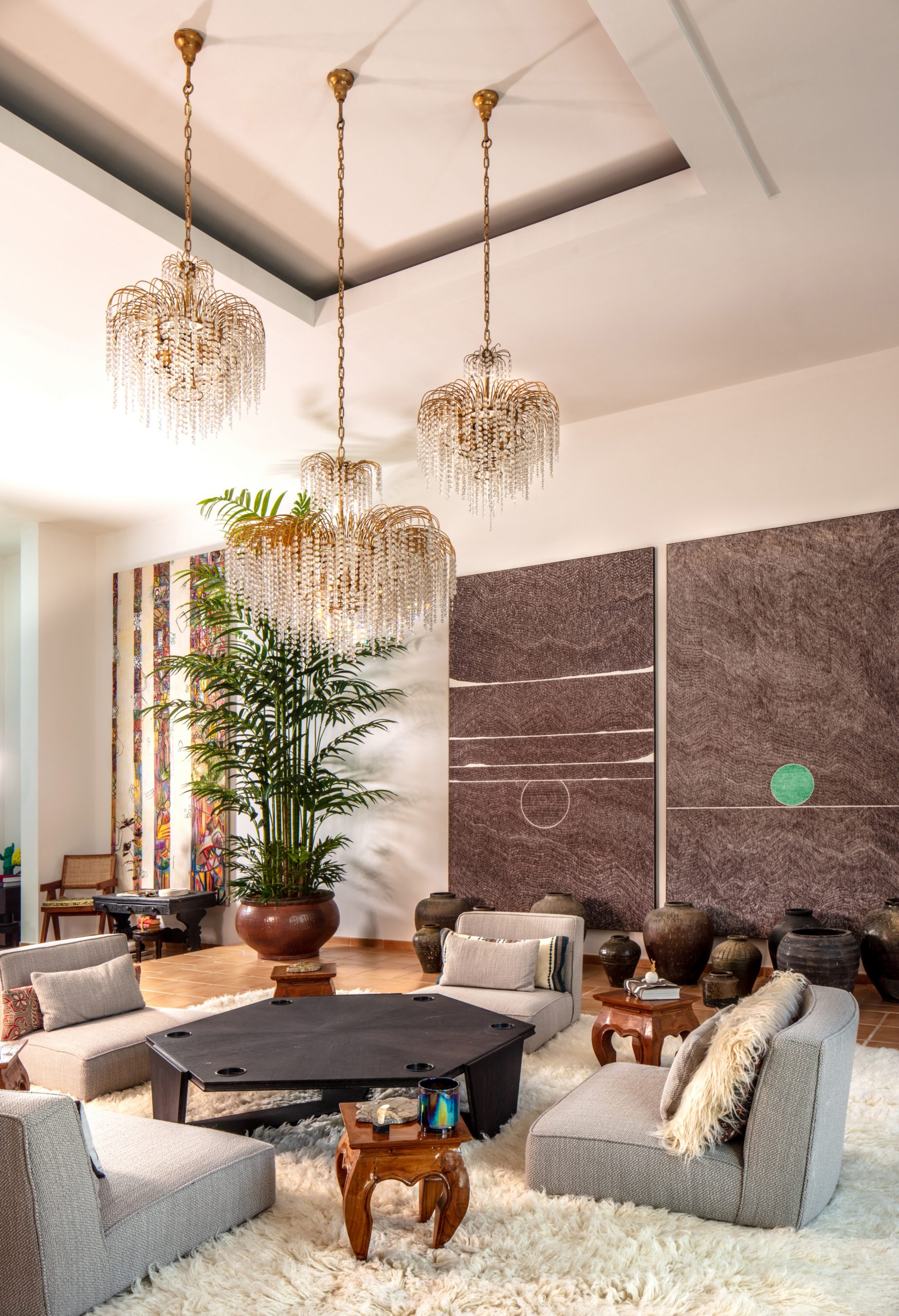 A trio of crystal chandeliers that once adorned the dining room of Princess Anoud’s great grandmother now form the centrepiece of the majlis. The low-level seating island central wooden table were custom made by Greek company Karageorgiou. To the far is a pastel-and-thread artwork by Greek artist Zoi Gaitanidou.