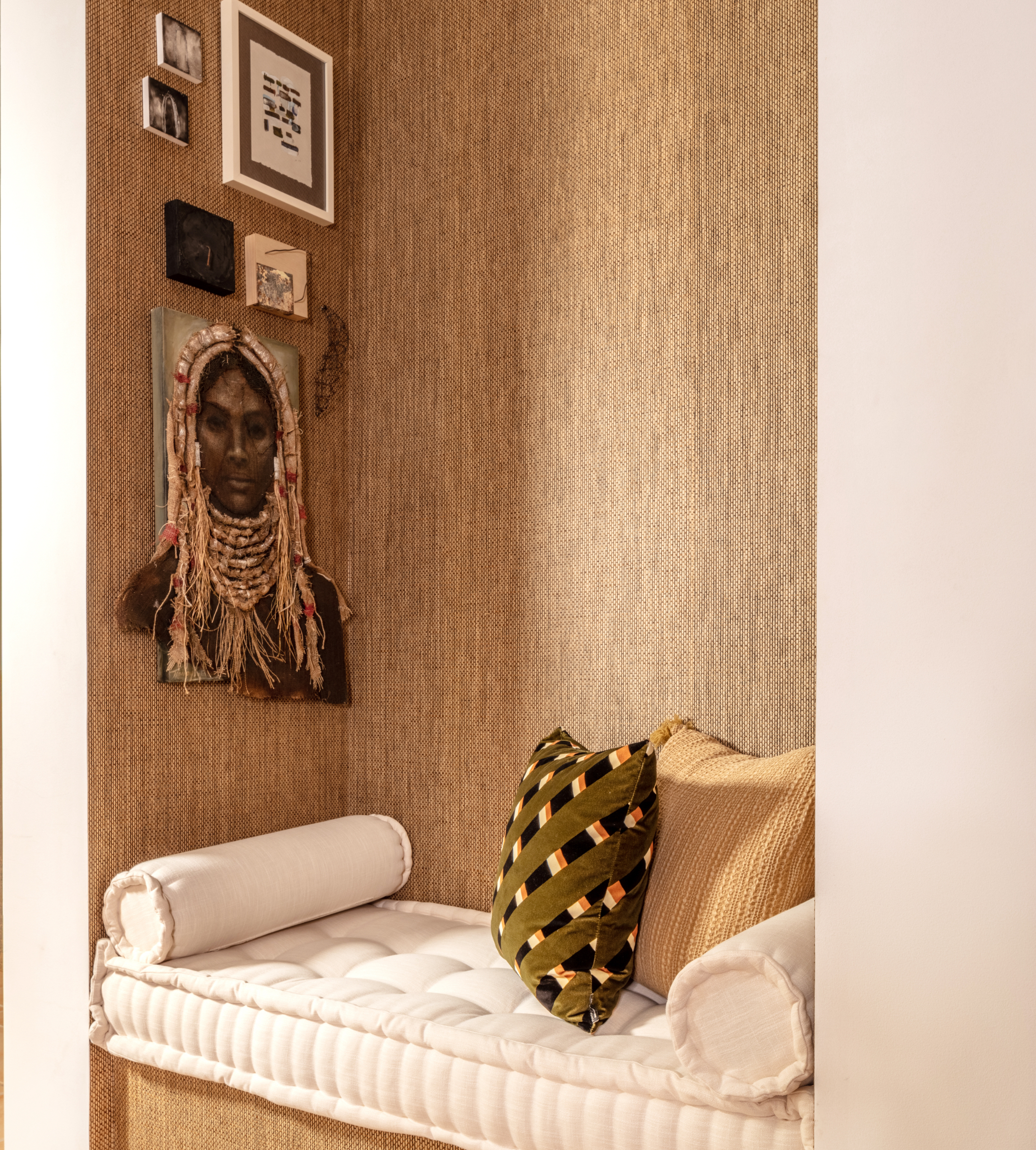 A small reading nook is made cosier with grasscloth wallcovering by Phillip Jeffries and artworks, including a figure of a woman in burlap and oil by the artist Loretta Tearney Warner from 1st Dibs.