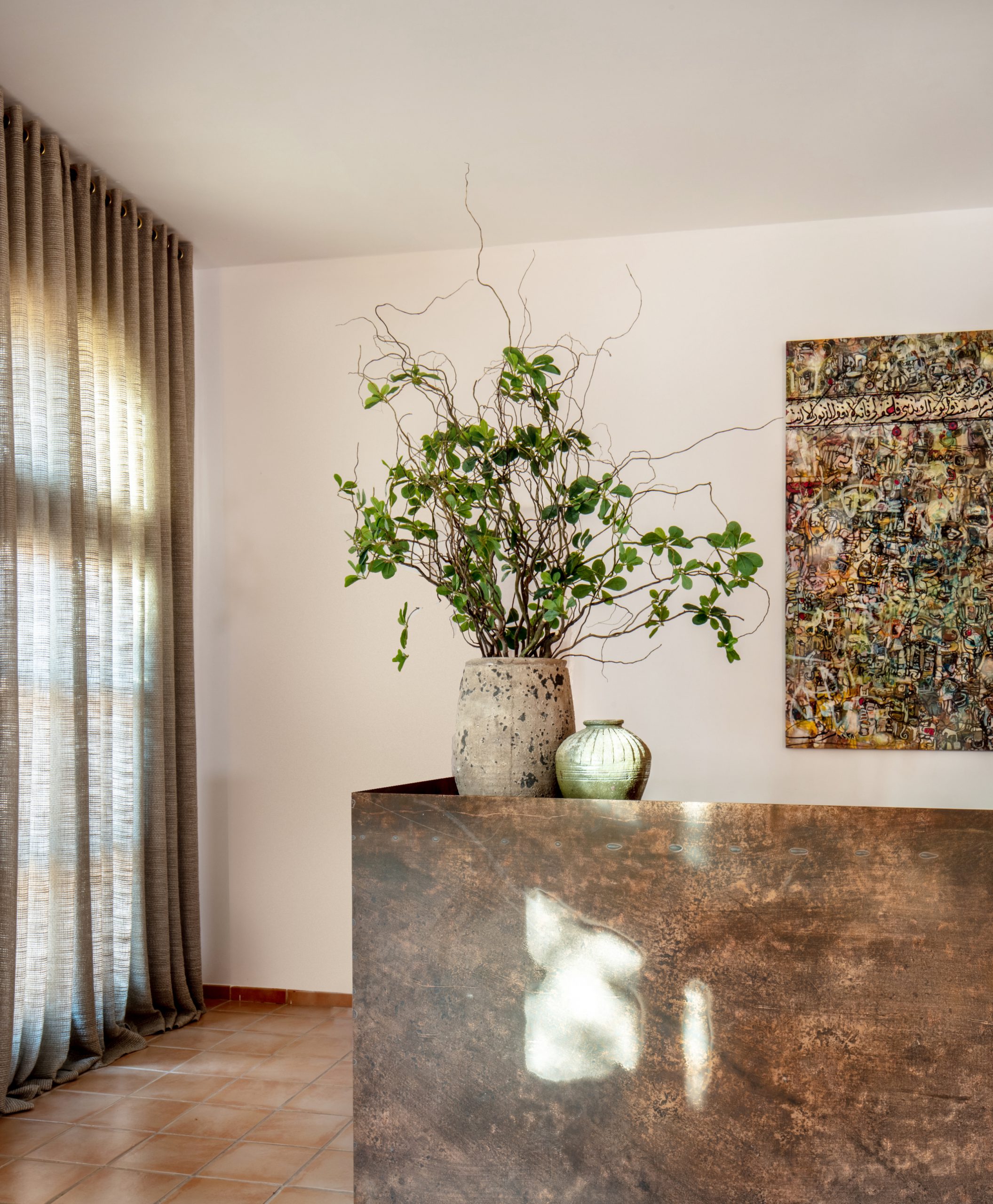 The Riyadh apartment of interior designer HRH Anoud Khalid Mishaal bin Saud embodies her eclectic style, mixing vintage and modern pieces with nature-inspired hues and statement art. A rusted metal partition in the dining room conceals a food prep area. The art work on the wall is by one of Princess Anoud’s favourite artists, Mohammed Al Ajalan.