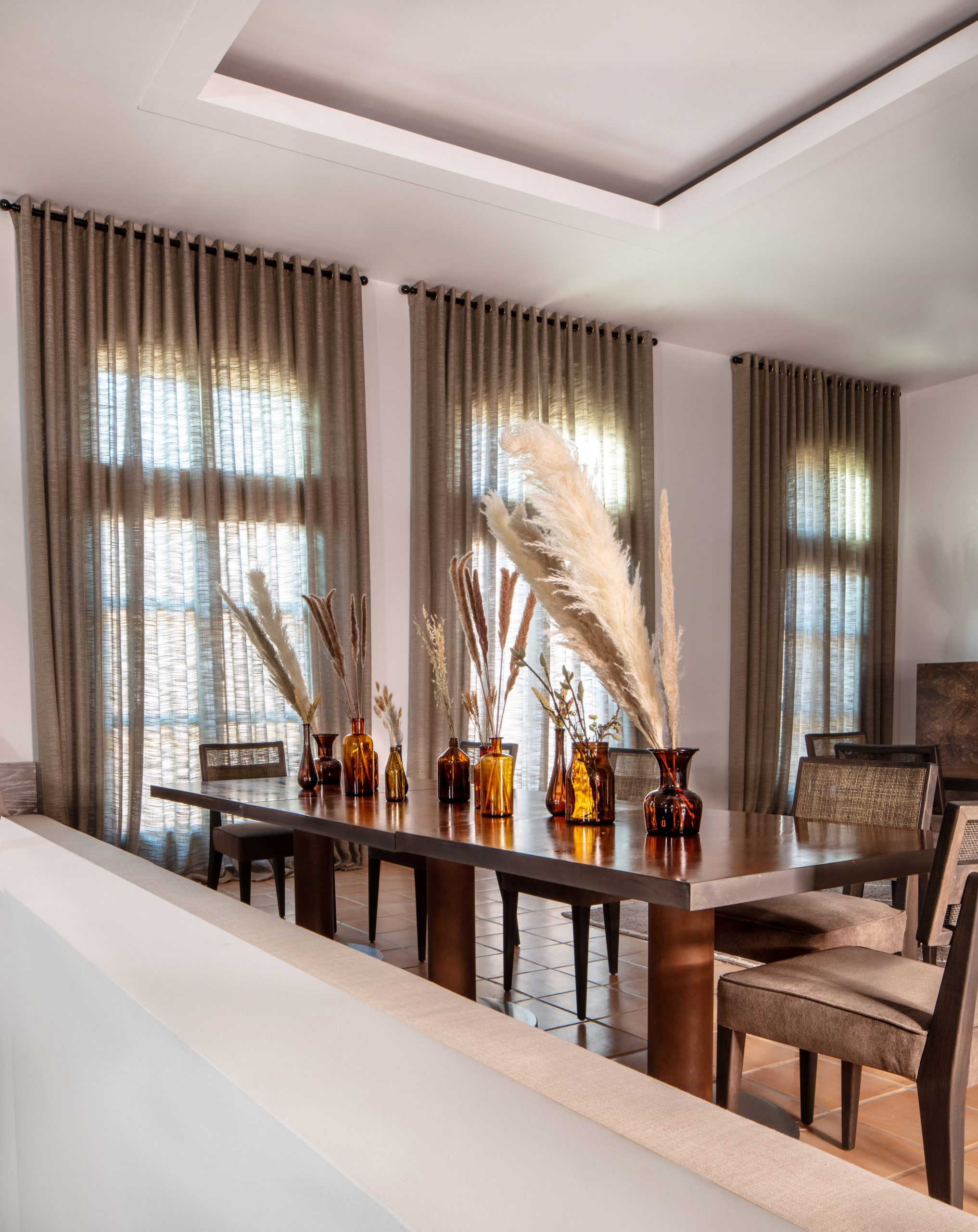 A collection of vintage amber glass vases adds warmth to the neutral dining space, and is filled with grass stems. The dining table was reclaimed from the princess’s childhood playroom and the chairs are custom-made pieces by Karageorgiou, inspired by a vintage design.
