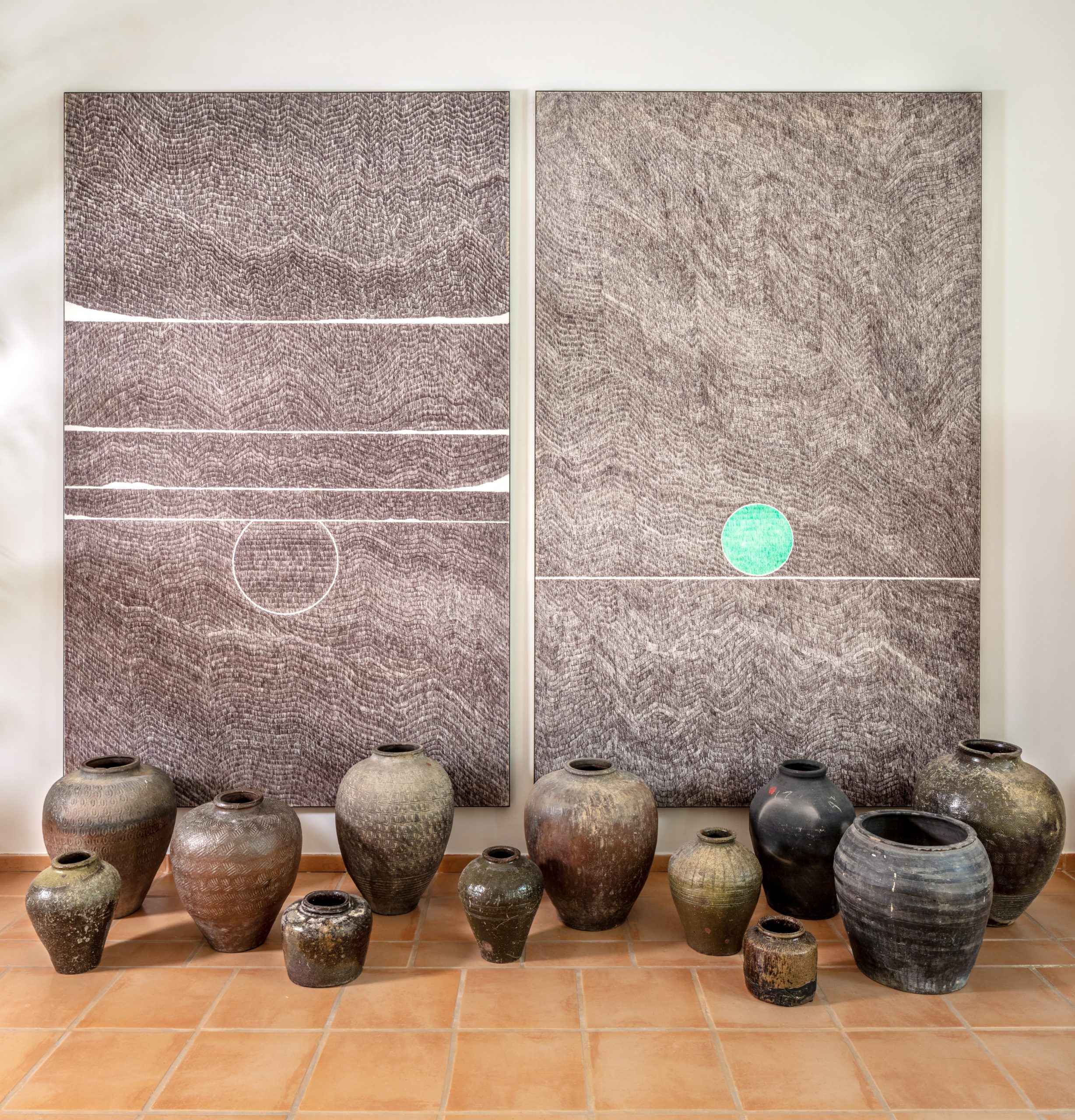 Two artworks in ballpoint pen by Greek artist Alexandros Tzannis,co-ordinate perfectly with a collection of vintage vases in the majlis.