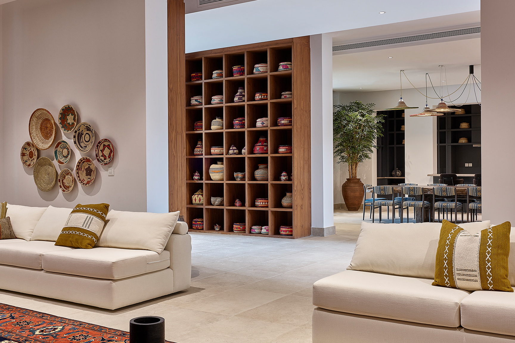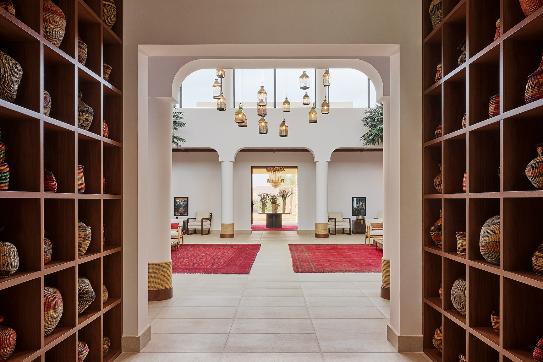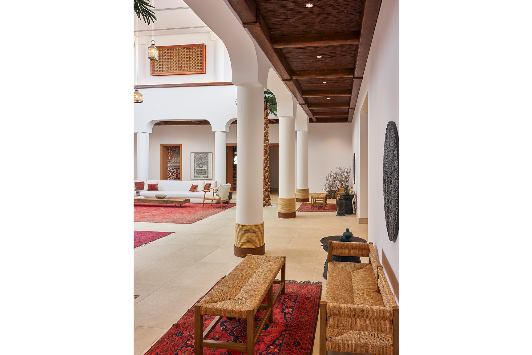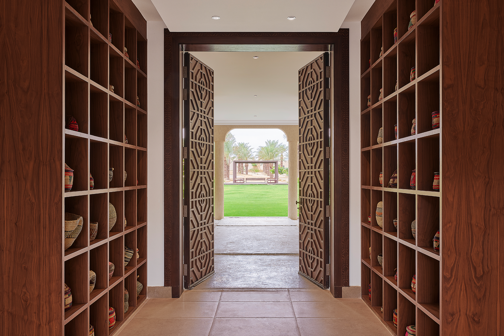 Light and airy rooms stretch both outwards and upwards. The scale of the interior is further exaggerated by the use of white for both walls and floors, creating a curated gallery effect. Deep reds representing the rich sands of the Sahara woven into the carpet bring color and interest to the space while hand-crafted objects and Sadu textiles covering cushions and chairs pay homage to the owner’s Arabic origins.