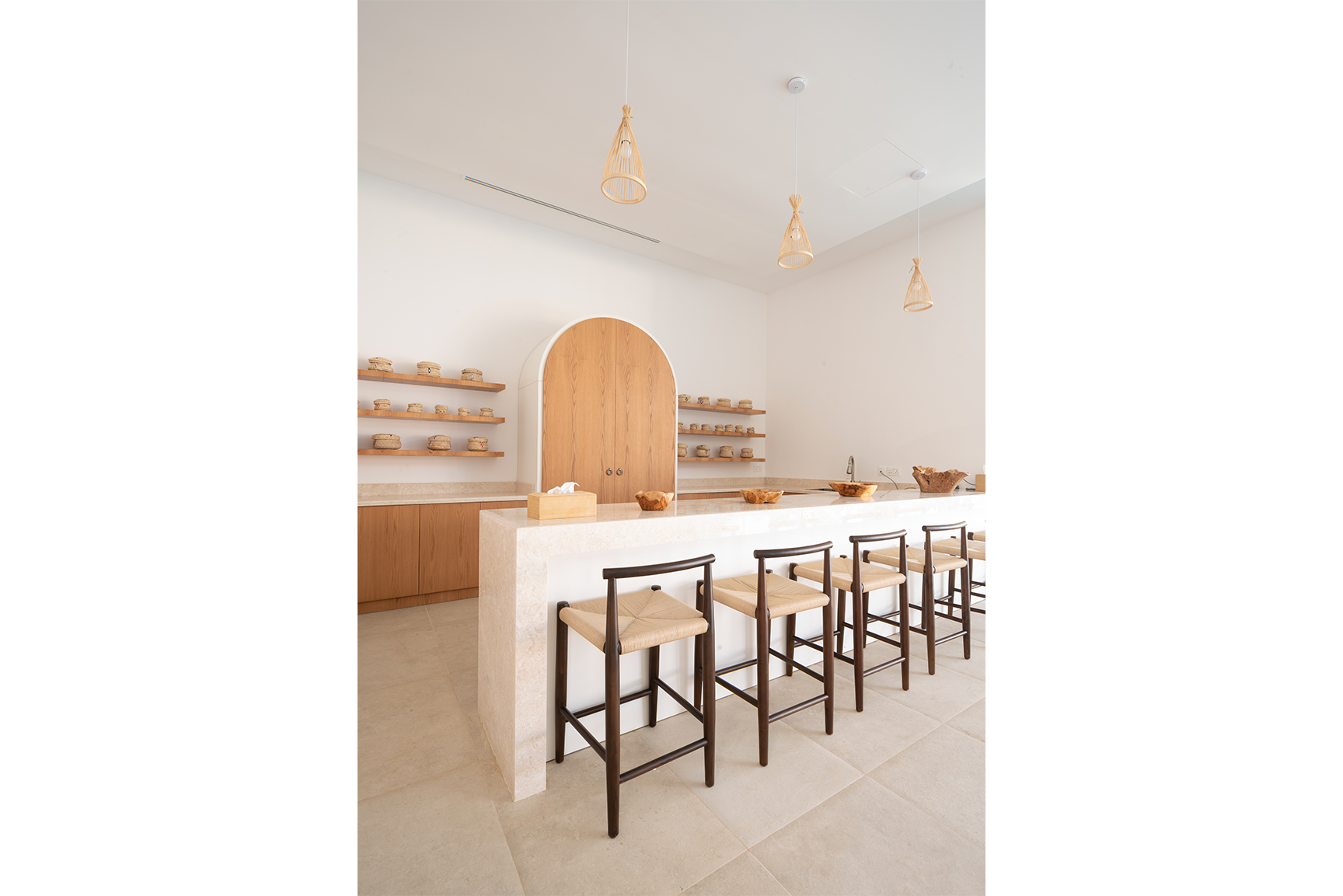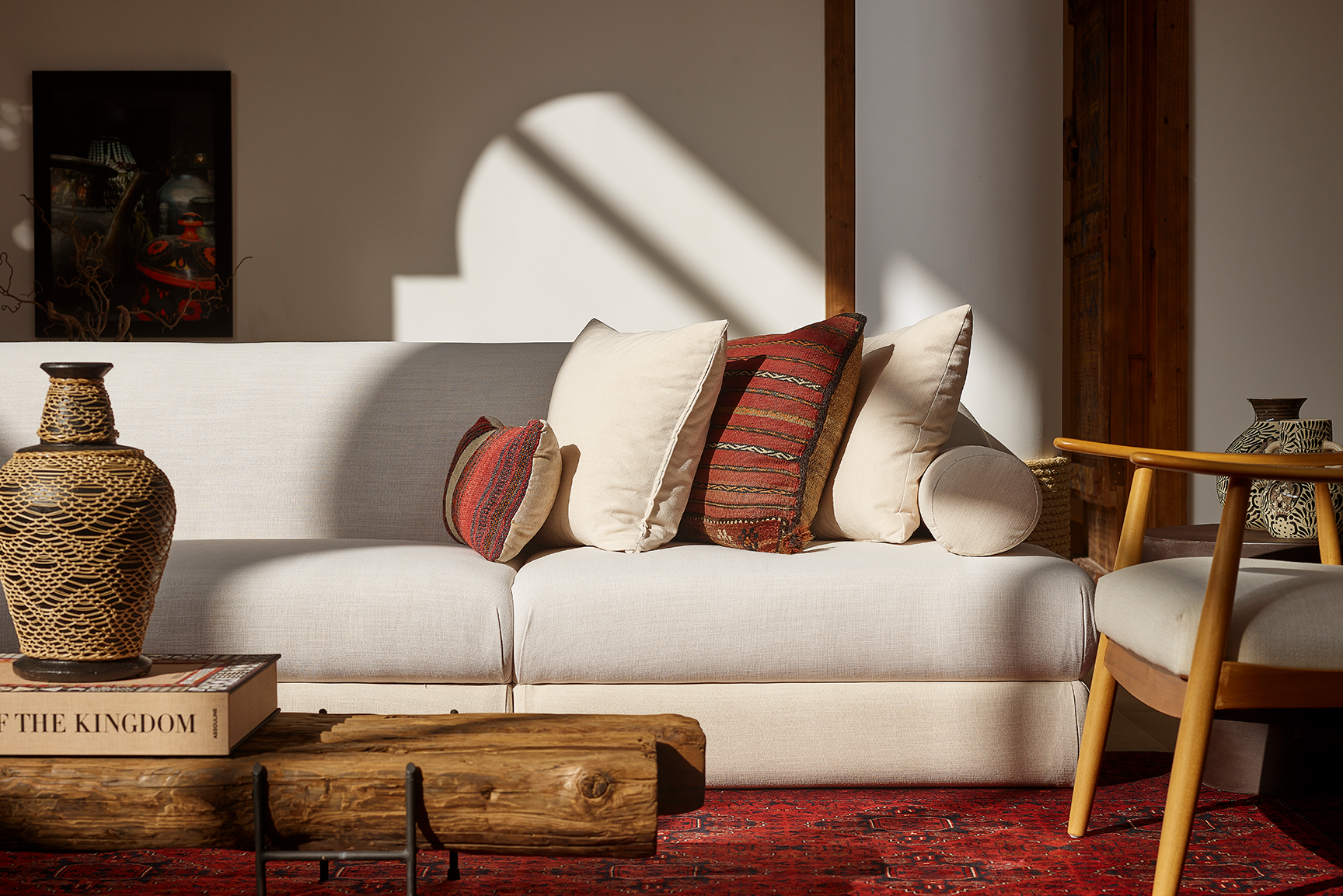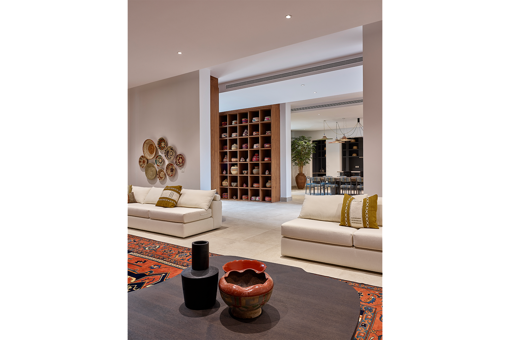 Light and airy rooms stretch both outwards and upwards. The scale of the interior is further exaggerated by the use of white for both walls and floors, creating a curated gallery effect. Deep reds representing the rich sands of the Sahara woven into the carpet bring color and interest to the space while hand-crafted objects and Sadu textiles covering cushions and chairs pay homage to the owner’s Arabic origins.