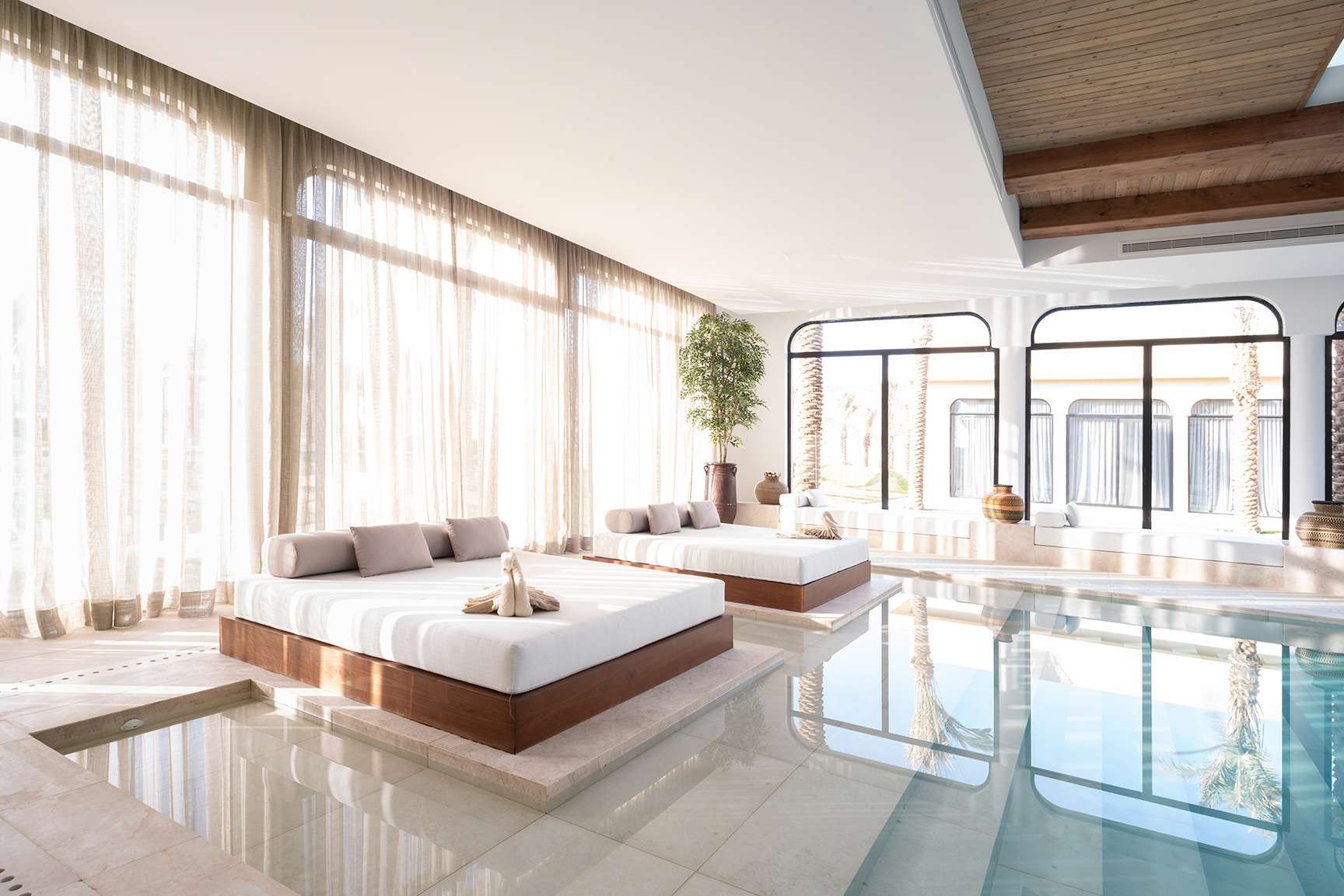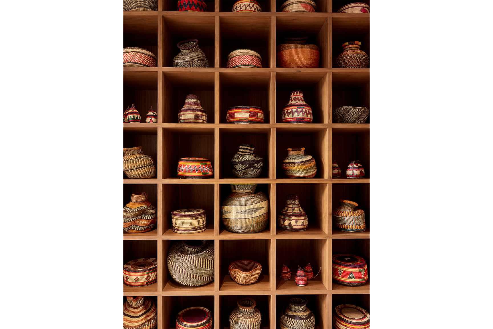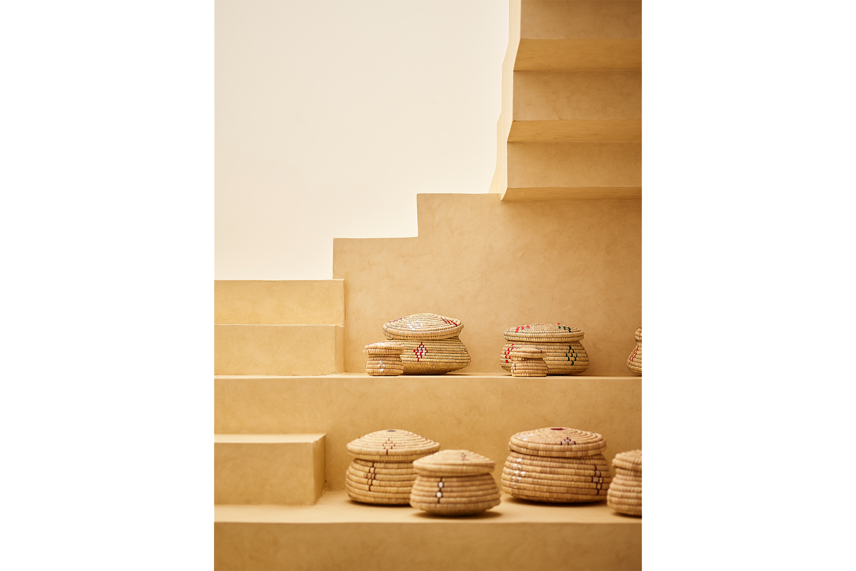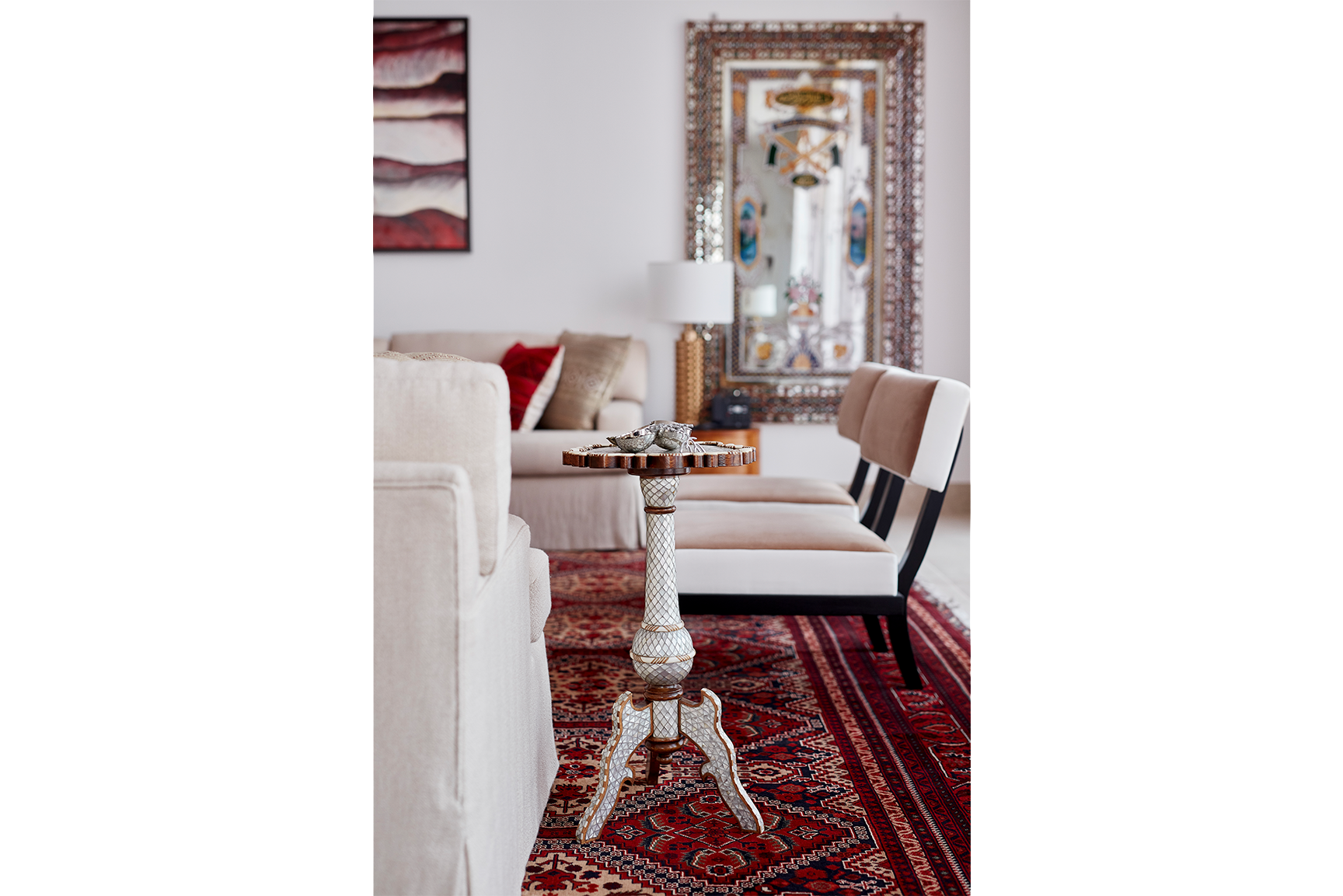 Light and airy rooms stretch both outwards and upwards. The scale of the interior is further exaggerated by the use of white for both walls and floors, creating a curated gallery effect. Deep reds representing the rich sands of the Sahara woven into the carpet bring color and interest to the space while hand-crafted objects and Sadu textiles covering cushions and chairs pay homage to the owner’s Arabic origins.