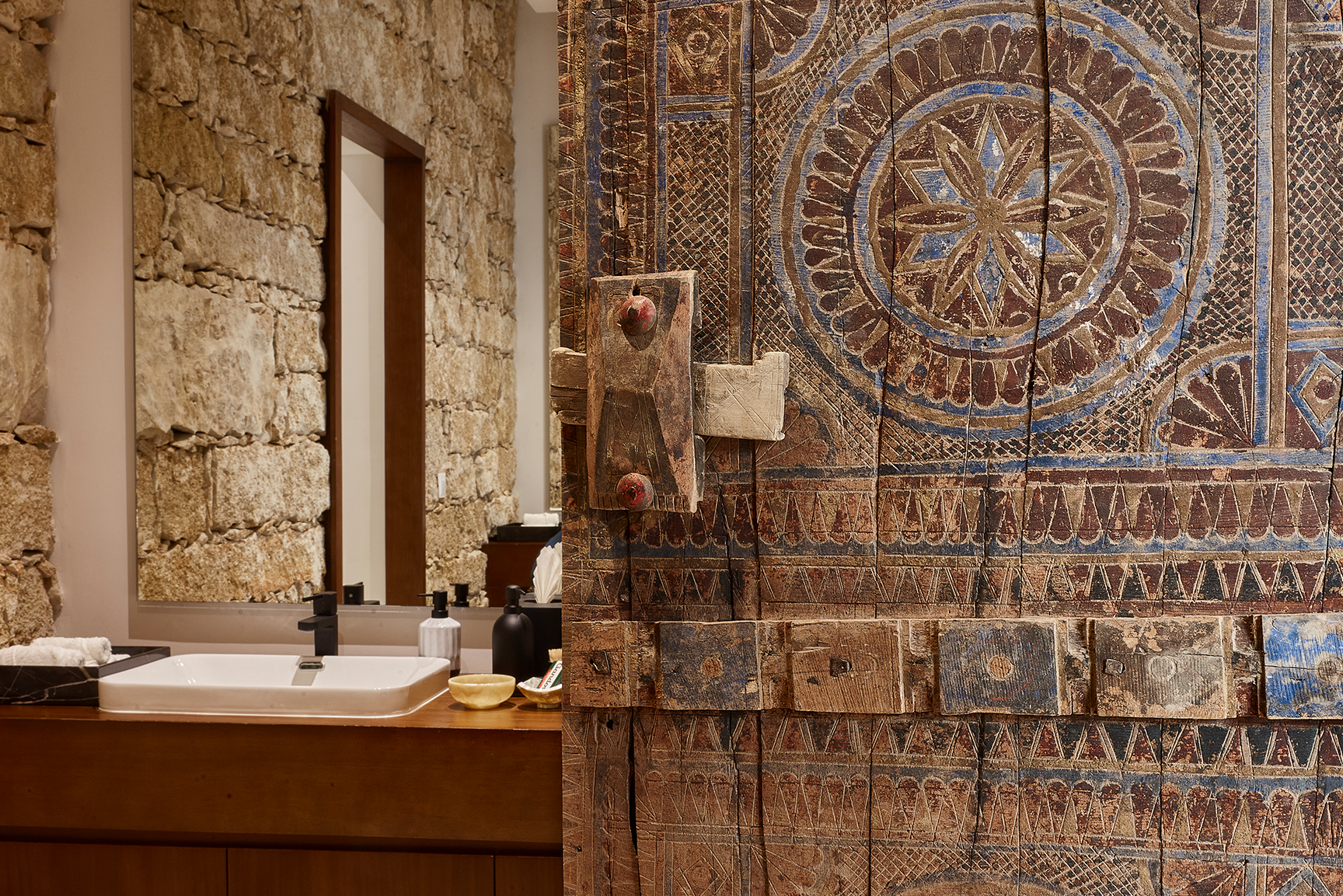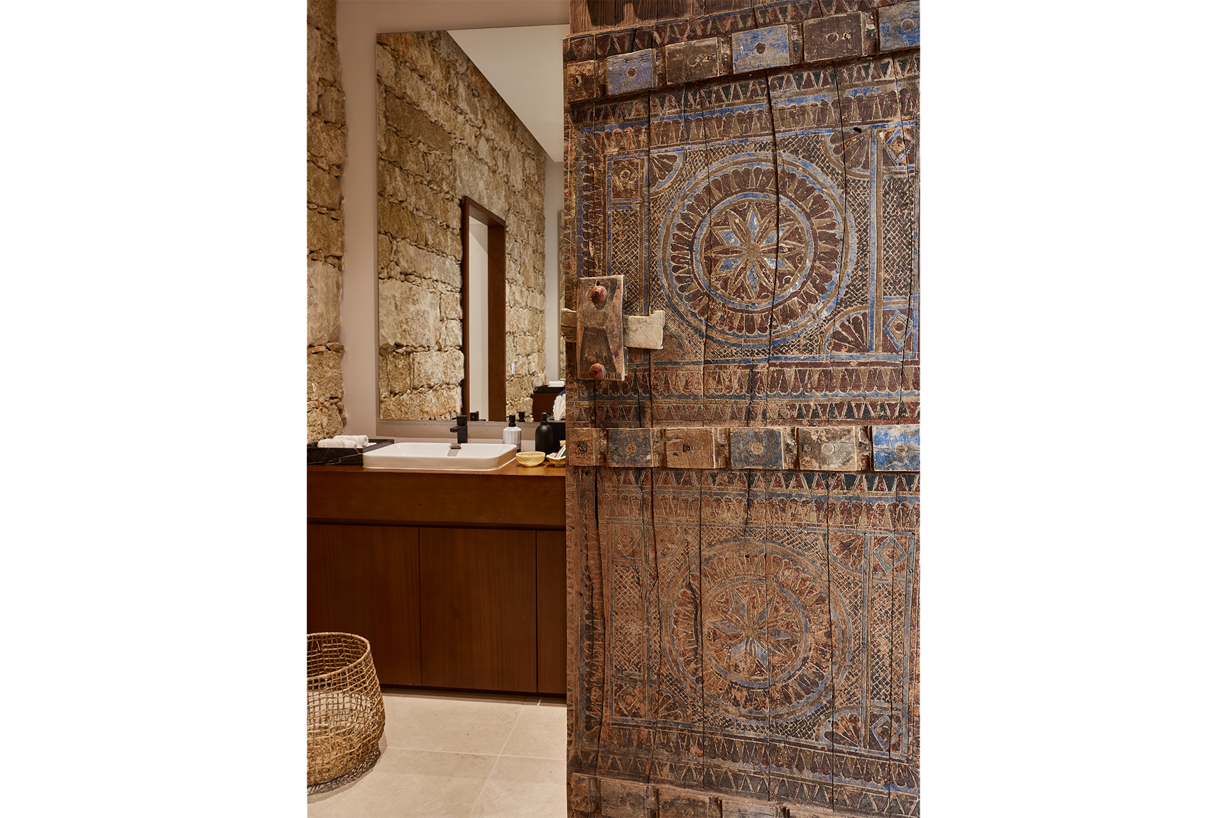 A mix of lighting blends traditional with contemporary. Throughout the villa a theme of crisp, clean white lines balances against dark, rounded shapes. This theme of opposites extends to a guest bathroom where an exposed natural stone wall hosts a stately, modern double sink.