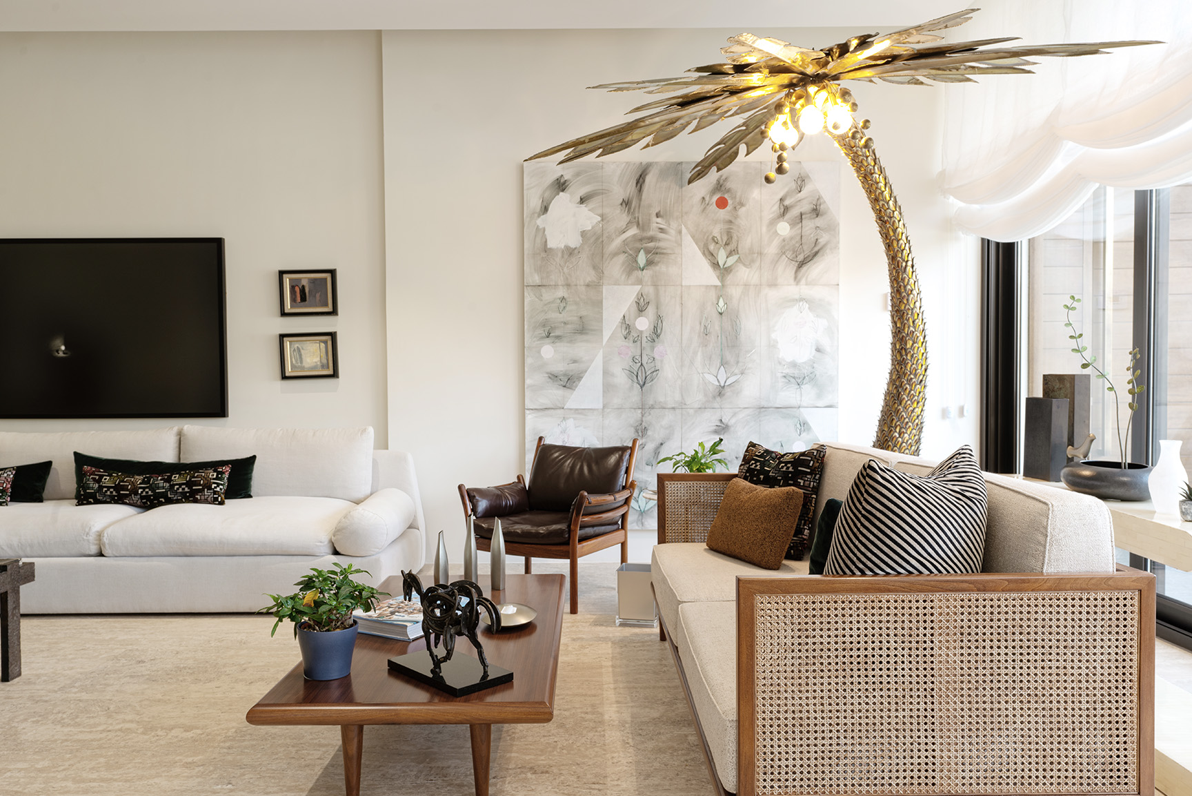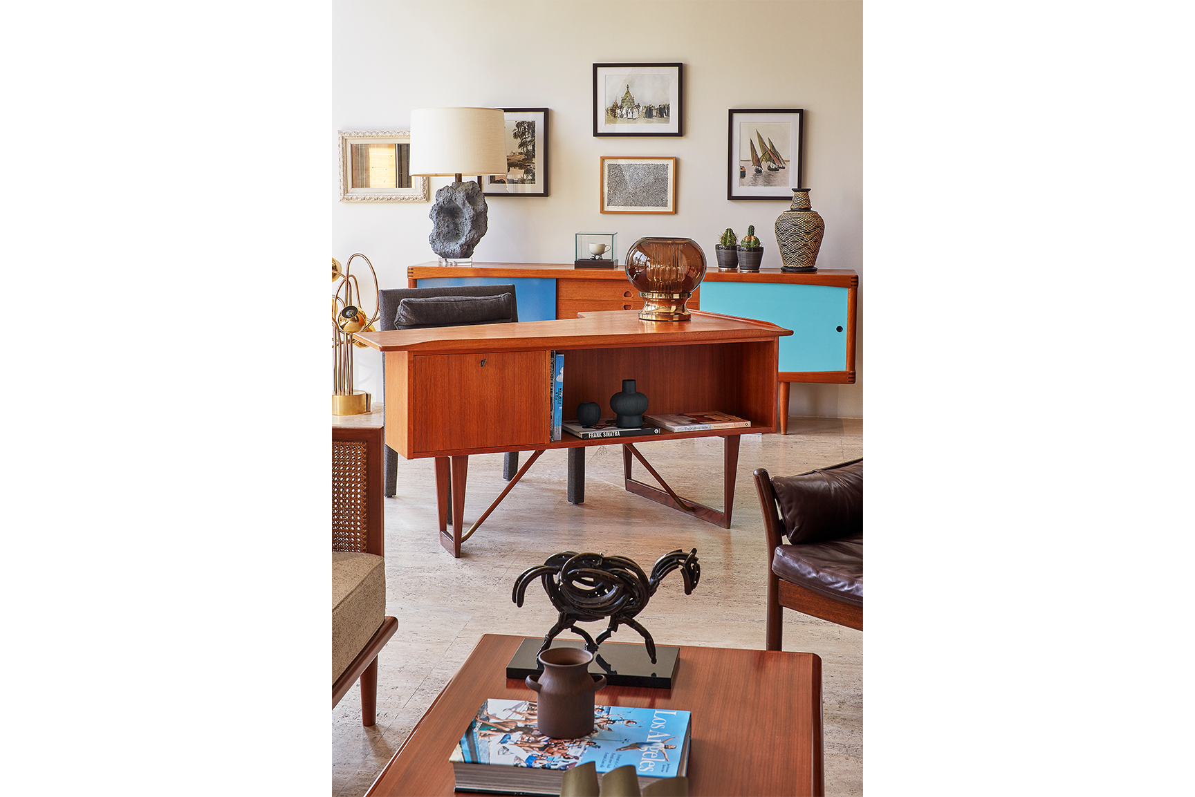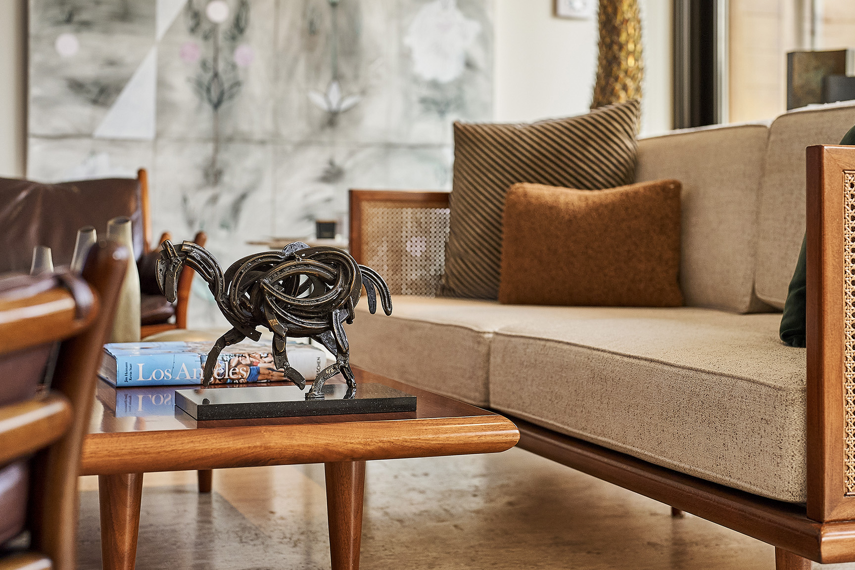 Setting the tone for the entire space is the residence’s lounge area, where masculine, luxurious leather chairs are counterbalanced by a mid-century inspired sofa set exuding subtle warmth.
